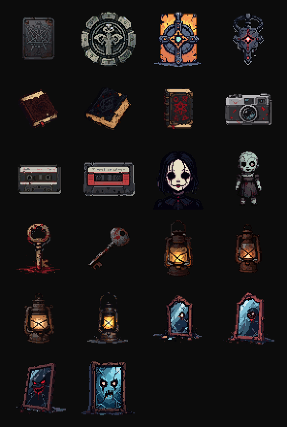 Pixel Horror Cursed Objects is a collection of handcrafted cursed items in dark pixel art style, designed for horror, RPG, roguelike, and survival games.